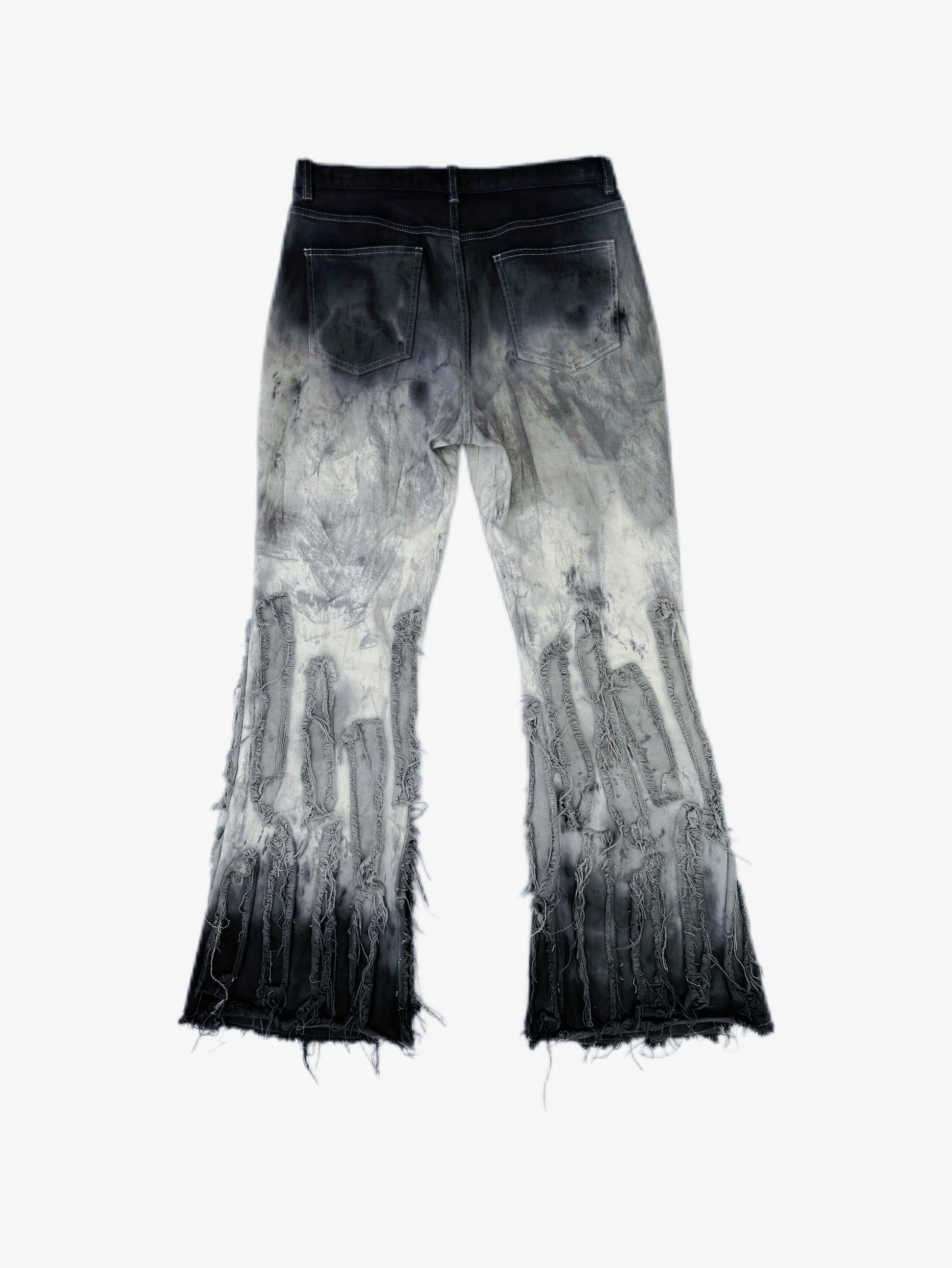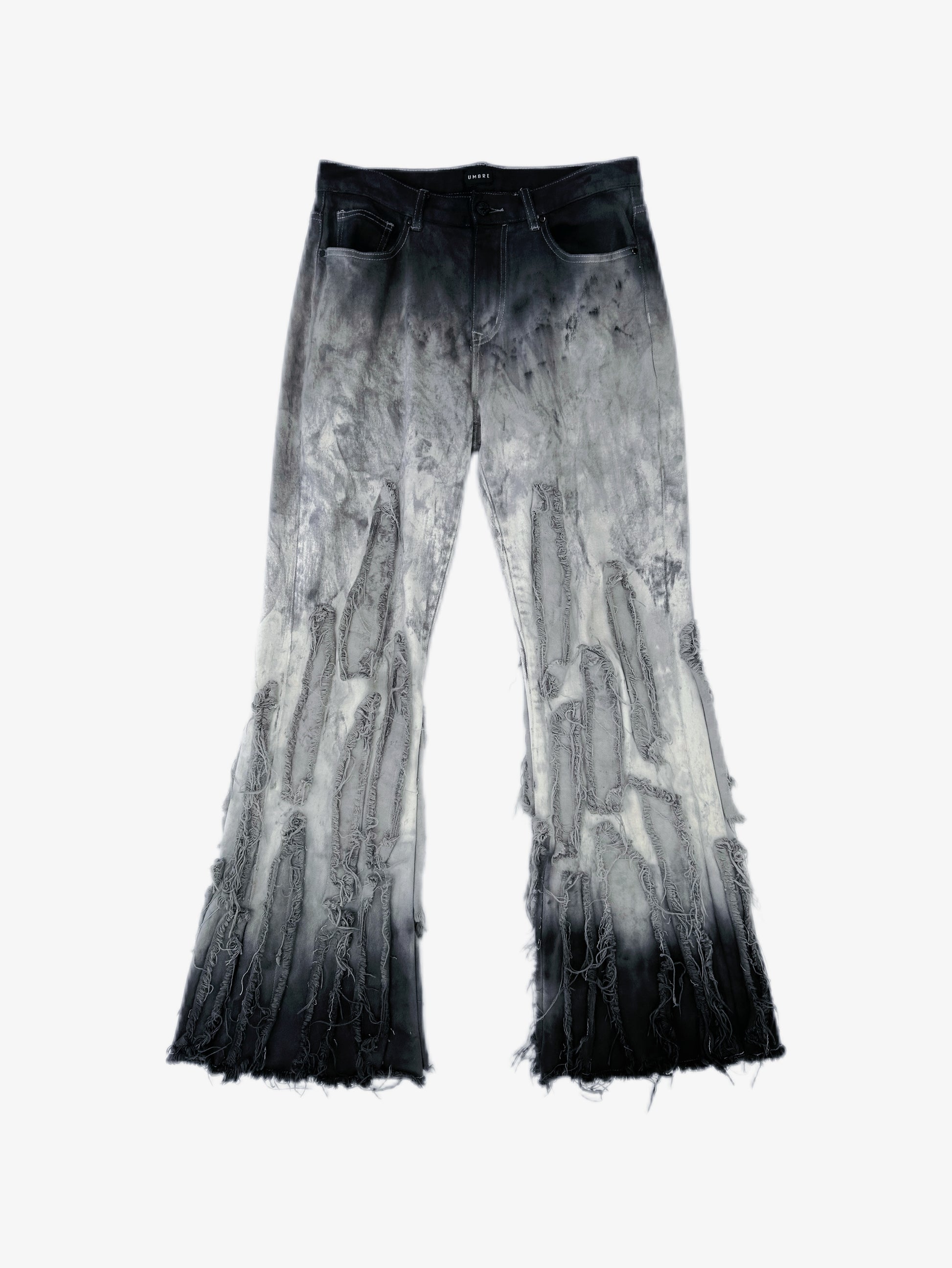 These upcycled flare pants feature a striking ombré wash that transitions from a smoky charcoal at the hem to a softer, ashen gray toward the waist, creating a UMBRE gradient effect. Hand-distressed with intricate frayed detailing and deconstructed panels running along the legs, they exude a raw, textured aesthetic. The high-quality denim base has been meticulously reworked, showcasing sustainability through thoughtful craftsmanship. With their unique combination of edgy design and artistic flare, these pants are a standout piece for those who embrace bold, statement-making fashion.