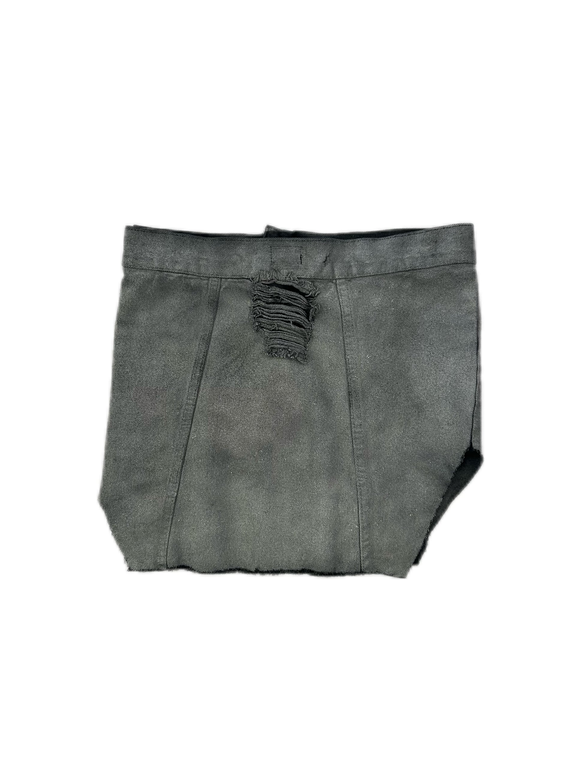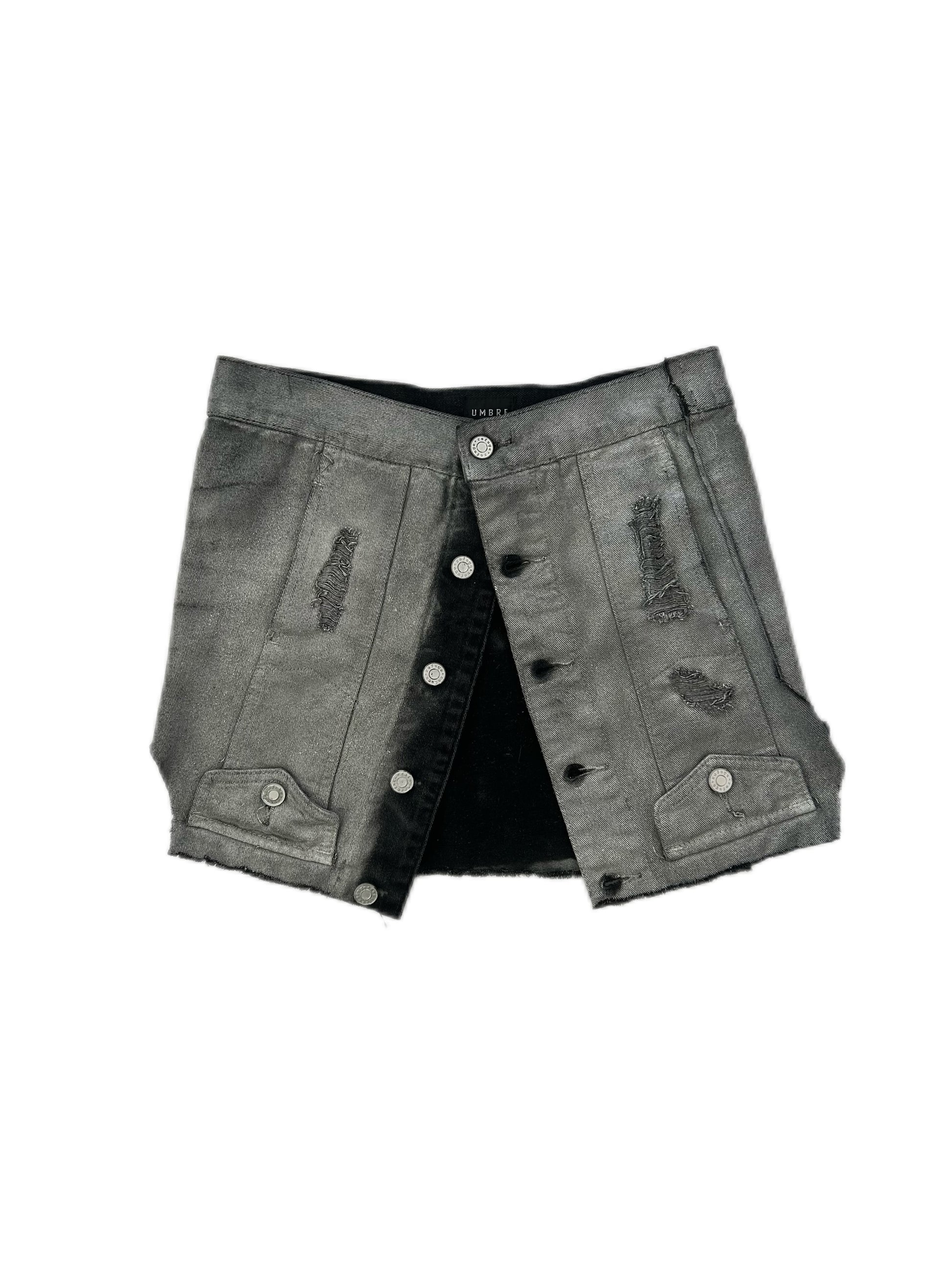 This upcycled skirt breathes new life into a former denim jacket, transforming it into a bold, contemporary piece. Featuring a distressed aesthetic and a smoky gray texture, it retains original elements like pocket details and button closures, adding a touch of rugged charm. The asymmetrical cut and reimagined design showcase creativity and sustainability, making it a statement piece perfect for edgy, streetwear-inspired looks. A testament to the beauty of reinvention, this skirt seamlessly blends functionality with fashion-forward style.