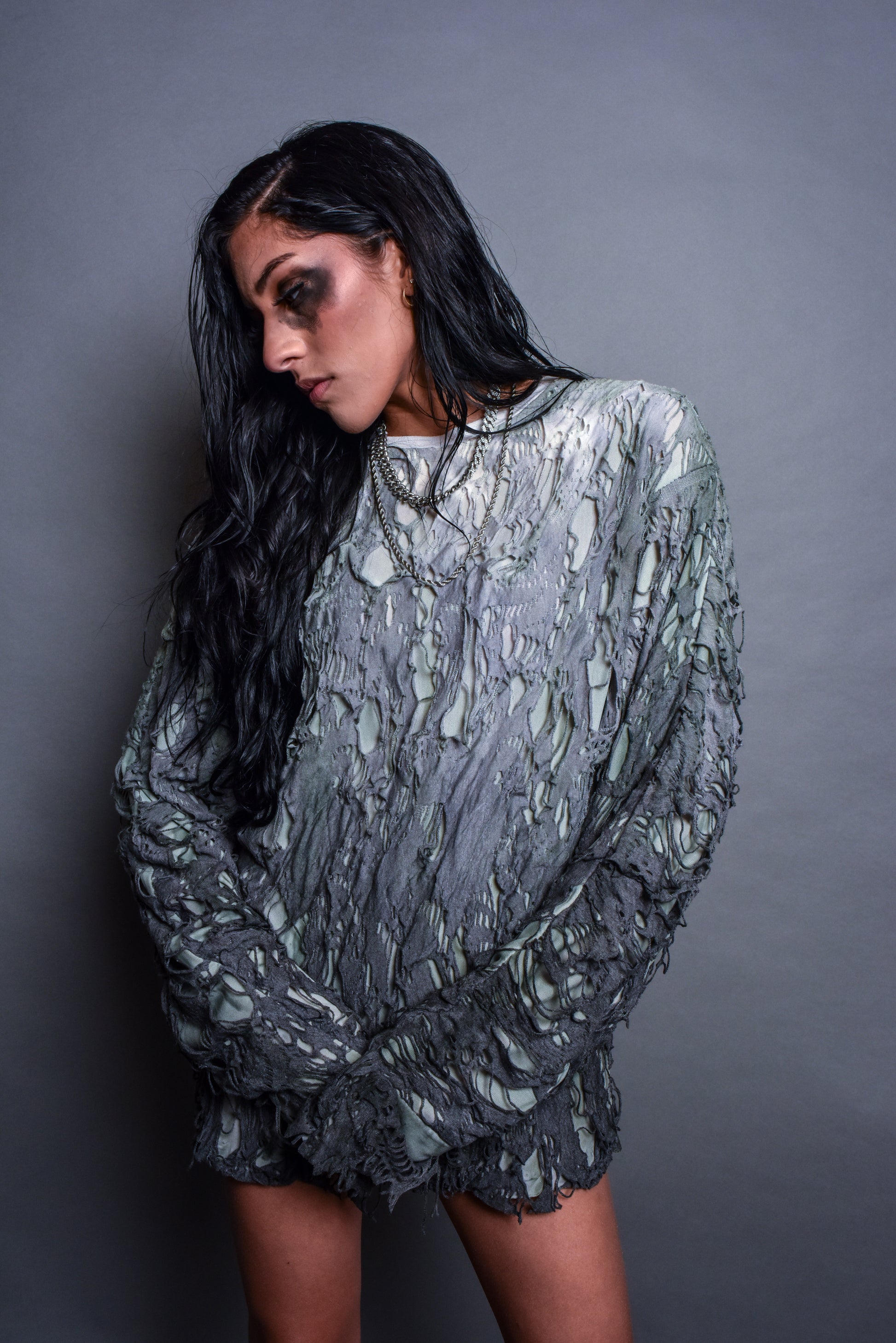 This upcycled shirt is a striking interplay of texture and depth, featuring a distressed, web-like design that exudes raw elegance. The UMBRE gradient effect transitions from light to dark, evoking the mysterious allure of fading color. Its intricate, shredded layers create a dynamic visual appeal, while the lightweight fabric ensures comfort and breathability. Perfect for adding an edgy yet sophisticated touch to any wardrobe.