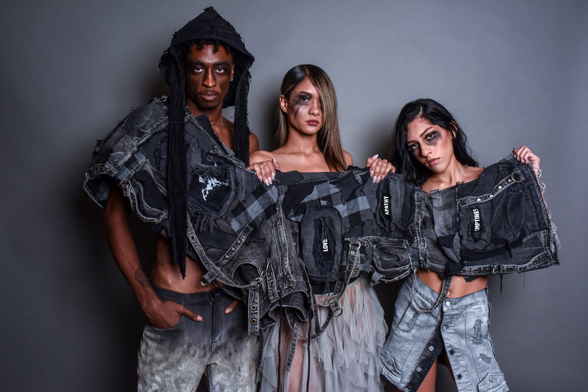 1 of 1, upcycled denim pants that redefine bold streetwear. Featuring a deconstructed design, they are adorned with layered patches showcasing words like “Apathy,” “Sorrow,” and “Emptiness,” creating a raw narrative of emotion and rebellion. Metal D-rings, studs, and adjustable straps enhance the industrial aesthetic, while the frayed edges and dark-washed tones emphasize their distressed, grunge-inspired look. A perfect piece for those who embrace edgy, avant-garde fashion.